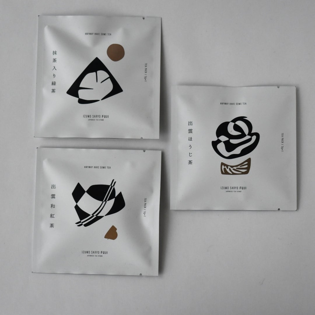 出雲茶寮藤がセレクトしたティーバッグ3種と、抹茶缶、抹茶シェイカーのセットです。