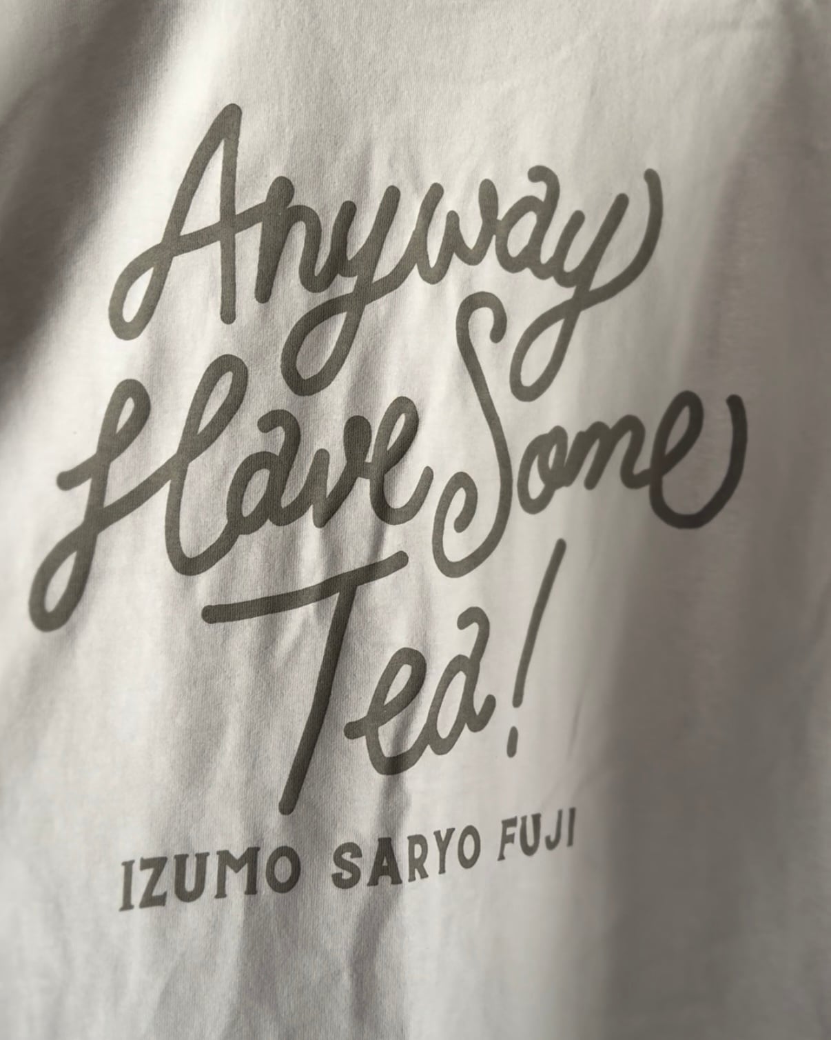 胸には、〝 Anyway Have Some Tea ! 〟(とりあえず、お茶飲みましょ!)がワンポイントに。